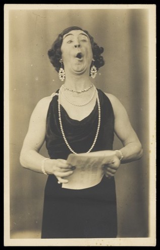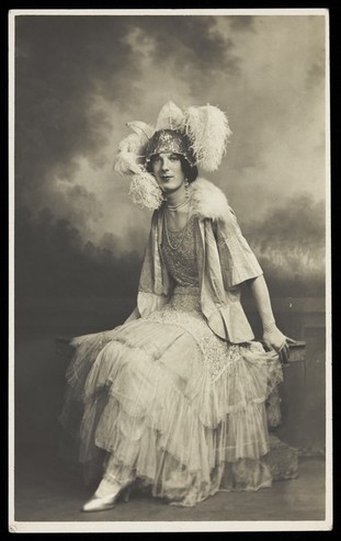 Collection: James Gardiner 20th Century Drag Postcards Institution: Wellcome Library Creator: Date: Jan. 1, 1934 Topics: Female impersonators Description: An unidentified young man in a stylish and expensive-looking costume, consisting of satin shoes and a tiered lace and tulle gown, the whole topped by a plumed and sequinned toque headdress -