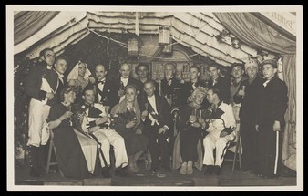 Collection: James Gardiner 20th Century Drag Postcards Institution: Wellcome Library Creator: Date: 1930? to 1945? Topics: Female impersonators Description: The actors, playing a variety of characters, are drinking and in conversation on stage, with lanterns hanging from the layered stage ceiling. A German amateur theatrical (presumably military) group... -