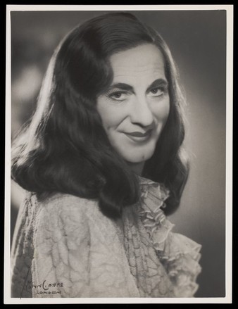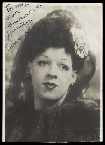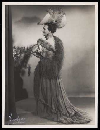 An actor in drag, posing for a portrait. Photograph by Mme Yvonne, 194-.