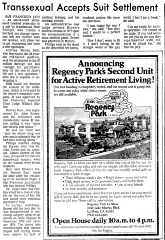 Collection: Newspaper and Periodical Clippings (1950-2000) Institution: Transas City Creator: The San Diego Union Date: Mar. 2, 1979 Topics: Augmentation mammaplasty, Courts, Fraud, Gender realignment surgery, Transsexual people Subject: Duncan Barr, James Spence, John Brown, Julie Phillips, Kathleen Unger, Melin Belli, William Mullins