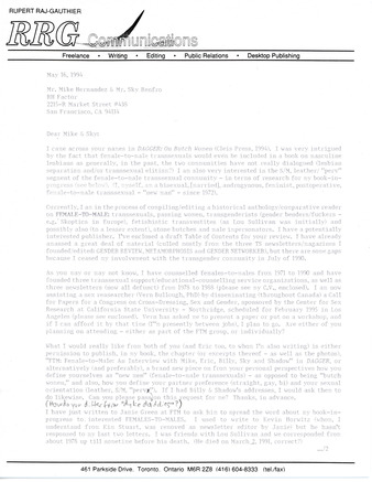 Collection: Rupert Raj Collection Institution: The ArQuives Creator: Raj, Rupert Date: May 16, 1994 Topics: FtMs, Gender identity, Sexual orientation, South Asian bisexual people, South Asian transgender people, Trans men, Transsexual people Subject: Rupert Raj Description: Letter from Rupert Raj to Mike Hernandez and Sky Renfro. Raj explains that he is working on a historical anthology focusing on trans people, and asks for permission to include a chapter from "Dagge... -