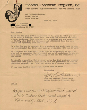 Collection: Lou Sullivan Collection Institution: GLBT Historical Society Creator: Sullivan, Lou, Tornabene, Angelo Date: Sep. 25, 1979 Topics: FtMs, Gender dysphoria, Hormone therapy, Plastic surgery, Psychiatry, Transitioning (Gender), Transsexual people Subject: Donald Laub, Stanford University Gender Dysphoria Program, The Labyrinth Foundation Counseling/Gender Service, Inc. -