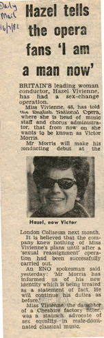Collection: Newspaper and Periodical Clippings (1950-2000) Institution: Transgender Archives, University of Victoria Creator: Date: Jul. 16, 1982 Topics: Acceptance, Conductors, FtMs, Gender realignment surgery, Transsexual people Subject: English National Opera, Victor Vivienne Description: Clipping originally collected by Richard Ekins (from The University of Ulster Trans-Gender Archives/Richard Ekins collection at the Transgender Archives, University of Victoria) -