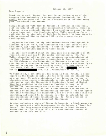 Collection: Lou Sullivan Collection Institution: GLBT Historical Society Creator: Sullivan, Lou Date: Feb. 6, 1989 Topics: Commemorative plaques, Discrimination, FtMs, Gender realignment surgery, HIV/AIDS, Medication, Physical health, Transgender community Subject: F2M, From Female to Male: The Life of Jack Bee Garland, Gender Worker, Information for the Female to Male Crossdresser and Transsexual, Ingersoll Gender Center, Ira B. Pauly, Metamorphosis Magazine -
