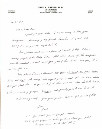Correspondence from Paul Walker to Lou Sullivan (September 8, 1987)