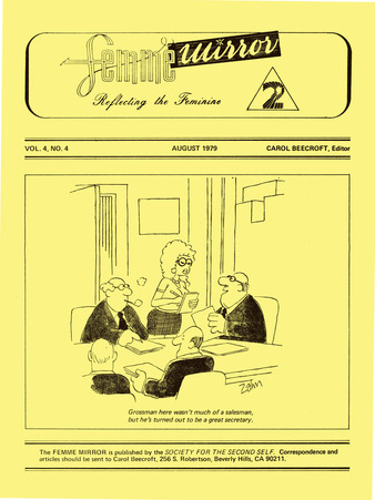Collection: Femme Mirror Institution: Joseph A. Labadie Collection, University of Michigan Creator: Beecroft, Carol Date: Aug. 1979 Topics: Acceptance, Appearance, Clothing, Communities, Crossdressers, Femininities, Gender role, Heterosexuals, Marriage, Passing (Gender), Self-acceptance, Support groups -