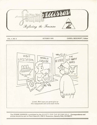 Collection: Femme Mirror Institution: Joseph A. Labadie Collection, University of Michigan Creator: Beecroft, Carol Date: Oct. 1979 Topics: Appearance, Biology, Clothing, Crossdressers, Crossdressing, Femininities, Fetishism, Gender role, Heterosexuals, Marriage, Passing (Gender), Prejudices, Support groups, Transgender people -