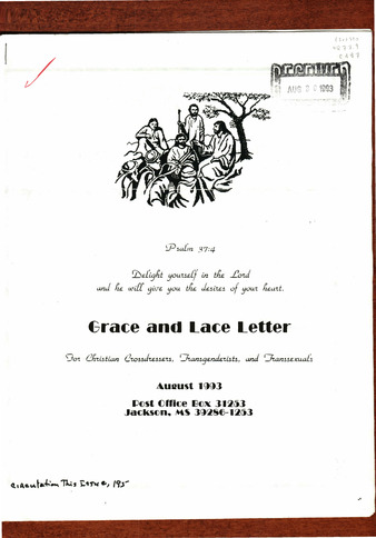 Collection: Grace and Lace Letter Institution: Transgender Archives, University of Victoria Creator: Heller, Lee Frances Date: Aug. 30, 1993 Topics: Christianity, Clothing, Crossdressers, Crossdressing, Families, Femininities, Gender dysphoria, Heterosexuals, Hormone therapy, LGBTQ+ Protestants, Marriage, Passing (Gender), Prejudices, Sexual relationships, Stigmatisation, Transgender people, Transitioning (Gender), Transsexual people, Transsexualism Subject: American Educational Gender Information Service, Inc. (AEGIS), Cross-Talk, Dallas Denny, Femme Mirror, Kimberleigh Richards, Merlin Carothers, Prison to Praise, Rebecca Allison, Roberta Flack -