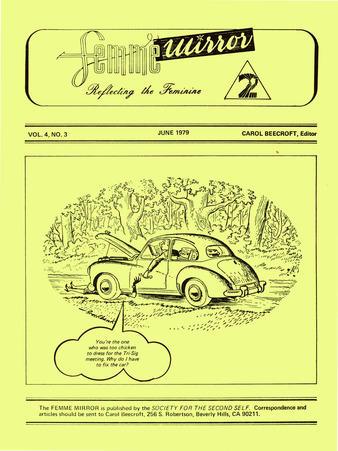 Collection: Femme Mirror Institution: Joseph A. Labadie Collection, University of Michigan Creator: Beecroft, Carol Date: Apr. 1982 Topics: Acceptance, Appearance, Clothing, Crossdressers, Femininities, Fetishism, Heterosexuals, Homosexuality, LGBTQ+ partners, Marriage, Sexual orientation, Support groups, Transgender community Subject: Tri-Ess Society for the Second Self -