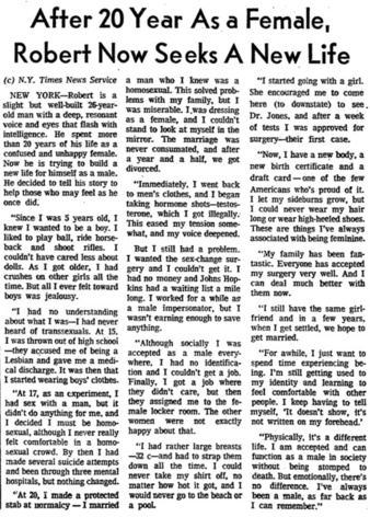 Collection: Newspaper and Periodical Clippings (1950-2000) Institution: Digital Transgender Archive Creator: Buckley, Thomas Date: Nov. 21, 1966 Topics: Gender affirming surgery, Gender dysphoria, Homosexuality, LGBTQ+ people of color, Medicalization, MtFs, Transsexual people, Transvestites Subject: Christine Jorgensen, Harry Benjamin, Mental Health, Reed Erickson, The Transsexual Phenomenon Description: A clipping from the New York Times talking about early gender affirming surgery done at Johns Hopkins. -