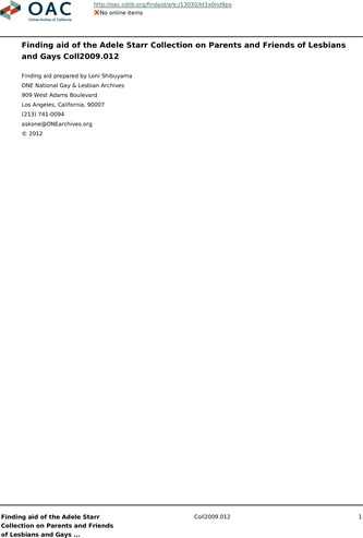 Collection: Discovery Resources Institution: ONE Archives at the USC Libraries Creator: ONE Archives, USC Libraries, University of Southern California Date: 2009 Topics: Family life education, Gay teenagers, Gay youth, Homosexuality, Lesbian youth, Parenting, Transgender children Subject: Adele Starr, Federation of Parents and Friends of Lesbians and Gays, Inc., Parents and Friends of Gays, Parents and Friends of Lesbians and Gays Description: Correspondence, minutes, photographs, clippings, manuscripts, financial records, pamphlets, education materials, flyers, posters, audiocassettes, textiles, ephemera and a banner from Adele Starr, d... -