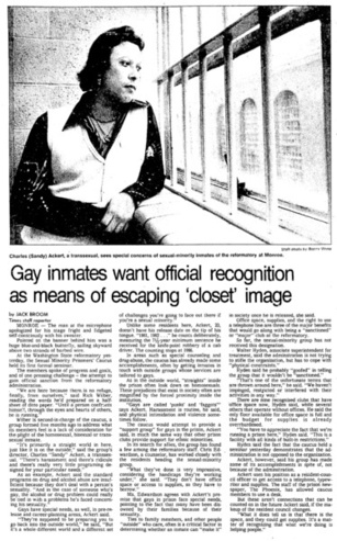 Collection: Newspaper and Periodical Clippings (1950-2000) Institution: Transas City Creator: Broom, Jack Date: Feb. 1, 1980 Topics: Bisexuality, Families, Harassment, Hate crimes, Homosexuality, Prejudices, Sexual minorities, Transsexual people Subject: Chris Edwardson, Rick Wilber, Sandy Ackert, Sexual Minority Prisoners' Caucus, Walter Hyden -