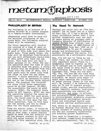 Collection: Metamorphosis Institution: The ArQuives Creator: Ghosh, Nicholas, Raj, Rupert Date: Jun. 1986 to Sep. 1986 Topics: Abuse, Civil rights, Family members, FtMs, Gender dysphoria, Gender realignment surgery, Health care, Health insurance, Homosexuality, Law, Masculinities, MtFs, Passing (Gender), Phalloplasty, Psychiatry, Religions, Transsexual people Subject: Alan Watts, American Lifestyles Information and Education Services Inc. (ALIES), Canon Clinton R. Jones, Erik Gray, Harry Benjamin, Harry Benjamin International Gender Dysphoria Association, Renee Richards, Reverend Canon Clinton R. Jones, Rush v. Johnson, Rush v. Parham, Second Serve, Self Help Association for Transsexuals (SHAFT), The Book On The Taboo Against Knowing Who You Are, The Mystery of Alexina, TV-TS Tapestry, Vanessa Redgrave, Washington D.C./Janus, Window To The World Services (WTTW) -