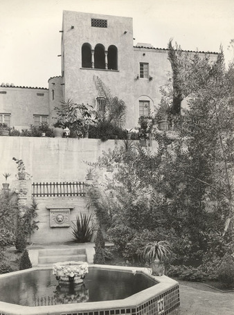 Collection: Miscellaneous Photographs Institution: California State Library Creator: Martin, Frederick W. Date: 1918 Topics: Female impersonators, Housing, Photography Subject: Julian Eltinge Description: View of the Julian Eltinge residence, 2337 Fargo Street. Shows Spanish Colonial Revival style two-story house with adobe walls, tile roof, wing and tower loggias, sunken gardens. Davis and Davis, a...