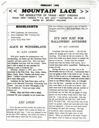 Mountain Lace: The Newsletter of Trans-West Virginia (February, 1993)
