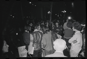 A Nighttime Photograph of Protestors Talking as Sylvia Rivera Holds a Sign in the Back...