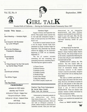 Collection: Renaissance News & Newsletters Institution: Joseph A. Labadie Collection, University of Michigan Creator: Silk, Cyndi Date: Sep. 1996 Topics: Children of transgender people, Coming out, Cosmetics, Crossdressers, Crossdressing, Fashion, Femininities, Gatherings, LGBTQ+ parents, Masculinities, Passing (Gender), Transgender people Subject: California Dreamin', Classic Curves, Clinique, GenderPAC, Goddess Corsetry, Judy's Hair Design, Lydia's T.V. Fashion, Mary Kay Makeup, Melody Products, Parklane Jewlery, The Pathfinders, Unity '97 S.O. Program, World of Wings