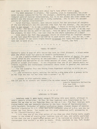 Collection: Newspaper and Periodical Clippings (1950-2000) Institution: Independent Voices Creator: Date: Mar. 1975 Topics: Drag, Gay men, Homophobia, Lesbians, LGBTQ+ partners, Television Subject: David Frost, Elaine Noble, Eleanor Cooper, Homosexuals: Out of the Closet, Sally Gearhart, Sally Lafferty, Tom Snyder -
