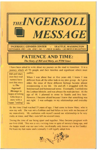 Collection: The Ingersoll Message Institution: Sexual Minorities Archives Creator: Butler, Pat Date: Sep. 1995 Topics: Activists, Children, FtMs, Gender identity, Hormones, LGBTQ+ partners, Marriage, Masculinities, Politics, Support groups Subject: Emerald OnRamp, Holiday Happening, Michigan Womyn's Music Festival