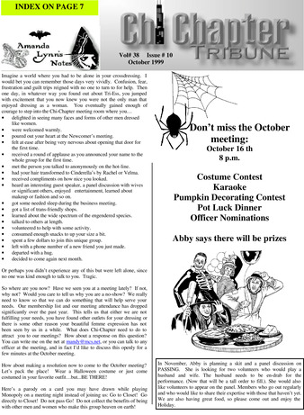Collection: Chi Chapter Newsletters Institution: Digital Transgender Archive Creator: Peters, Denise Date: Oct. 1999 Topics: Coming out, Crossdressers, Crossdressing, Elections, Gender dysphoria, Halloween, LGBTQ+ partners, Passing (Gender), Roman catholicism, Support groups, Transgender people Subject: Ann Sathers, David Whyte, Positive Attitudes Living Side by side (PALS), Puttin on the Ritz, The Great Lakes Gender Leadership Conference, Tri-Ess Society for the Second Self Description: Periodical name changed from "The Chi Tribune" starting with Vol. 36 No. 2 (February, 1997) -