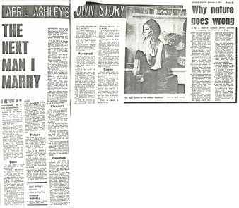Collection: April Ashley Collection Institution: Transgender Archives, University of Victoria Creator: Ashley, April Date: Feb. 15, 1970 Topics: Acceptance, Appearance, Gender role, Hormones, Law, LGBTQ+ relationships, Marriage, MtFs, Petitions, Sexuality, Transsexual people Description: Clipping originally collected by Richard Ekins (from The University of Ulster Trans-Gender Archives/Richard Ekins collection at the Transgender Archives, University of Victoria) -