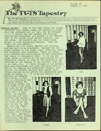 Collection: Transgender Tapestry Institution: Transgender Oral History Project Creator: Lynn, Merissa Sherrill Date: Jun. 2, 1980 Topics: Crossdressers, Crossdressing, Lingerie, Social activities clubs, Transgender movement, Transsexual people Description: Also known as: "The TV Tapestry", "The Tapestry", "Tapestry" and "TV/TS Tapestry Journal." ; Magazine name changes to "Transgender Tapestry" starting with issue 74, winter 1995. -