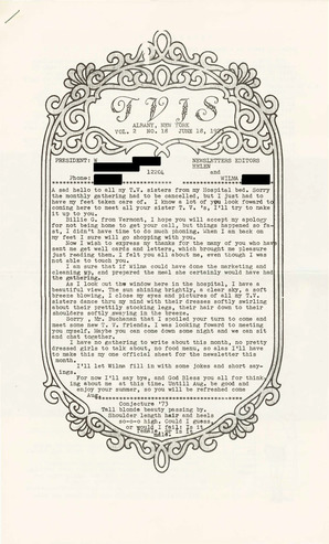 Collection: Upstate New York Newsletters Institution: Human Sexuality Collection, Cornell University Creator: Thordsen, Wilma, Thordsen, Helen Date: Oct. 15, 1983 Topics: Acceptance, Appearance, Clothing, Crossdressers, Crossdressing, Discrimination, Femininities, Gatherings, Gender dysphoria, Gender realignment surgery, Homosexuality, Letters, LGBTQ+ partners, LGBTQ+ sex workers, Lingerie, Marriage, Masculinities, MtFs, News magazines, Passing (Gender), Police, Support groups, Transgender people -