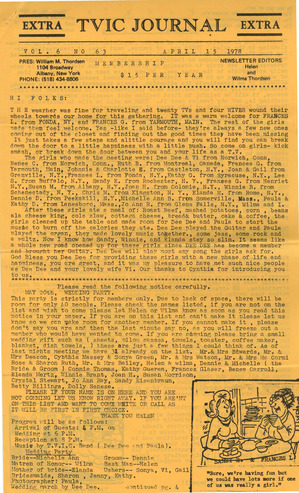 Collection: Upstate New York Newsletters Institution: Human Sexuality Collection, Cornell University Creator: Thordsen, Wilma, Thordsen, Helen Date: Apr. 19, 1980 Topics: Acceptance, Appearance, Clothing, Crossdressers, Crossdressing, Discrimination, Families, Femininities, Gatherings, Gender dysphoria, Gender identity, Gender realignment surgery, Hormone therapy, Hormones, Hydrolysis, LGBTQ+ partners, Marriage, Masculinities, MtFs, Passing (Gender), Police, Sports clubs, Transgender people -