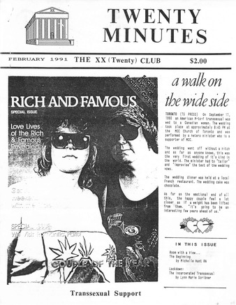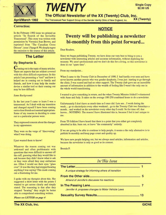 Collection: Twenty Minutes Institution: Sexual Minorities Archives Creator: The XX Club Date: Apr. 1990 Topics: Cartoons, Christianity, Crossdressing, Drag, Fear of death, FtMs, Gender dysphoria, Gender realignment surgery, Hormones, Law, MtFs, Transsexual people Subject: Americans with Disabilities Act, Civil Rights Act, Diana Ross, Don Peterson, International Foundation for Gender Education (IFGE), Michael Jackson, No Name Men's Club, Quad-Eff, Richard Pryor, Robert McNeal, The XX Club, Tri-Ess Society for the Second Self -