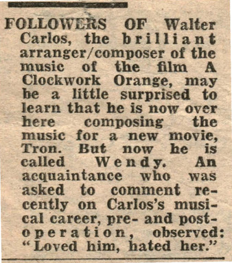 Collection: Newspaper and Periodical Clippings (1950-2000) Institution: Transgender Archives, University of Victoria Creator: Date: Mar. 29, 1982 Topics: Composers, Film industry, MtFs, Music, Transitioning (Gender), Transsexual people Subject: A Clockwork Orange, Tron, Wendy Carlos Description: Clipping originally collected by Richard Ekins (from The University of Ulster Trans-Gender Archives/Richard Ekins collection at the Transgender Archives, University of Victoria) -