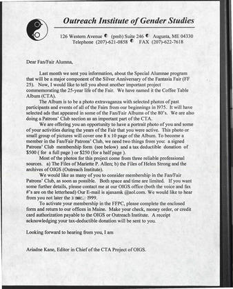 Collection: Fantasia Fair: Miscellaneous Documents Institution: Schlesinger Library, Radcliffe Institute for Advanced Study, Harvard University Creator: Kane, Ariadne Date: 1999 Topics: Organisations, Patronage, Photo books Subject: Coffee Table Album (CTA), Fan/Fair Patron's Club (FFPC), Fantasia Fair, Helen Strong, Mariette Pathy Allen, Outreach Institute of Gender Studies (OIGS), Special Alumnae Program -