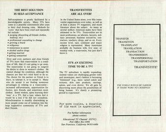 Collection: Informational and Event Brochures Institution: GLBT Historical Society Creator: Date: Unknown Topics: Acceptance, Appearance, Crossdressers, Crossdressing, Femininities, Mental health, Passing (Gender), Self-acceptance, Transgender people Subject: Educational TV Channel (ETVC) Description: Item originally collected by Lou Sullivan. -