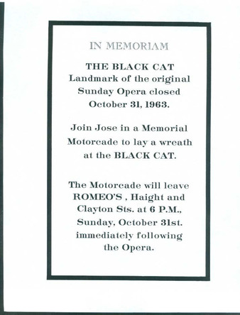 Collection: Ephemera Institution: JD Doyle Archives Creator: Date: Unknown Topics: Drag, LGBTQ+ bars, LGBTQ+ events, LGBTQ+ musicians, LGBTQ+ night life, LGBTQ+ theater, Performance art Subject: Black Cat Bar, José Sarria Description: An advertisement for the closing of the Black Cat Cafe, which mentions that José Sarria will perform there October 31, 1963 to say goodbye to the bar. -