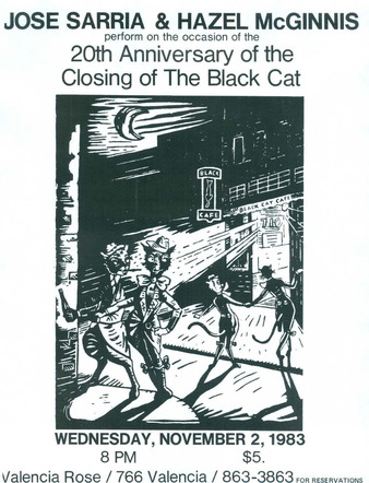Collection: Ephemera Institution: JD Doyle Archives Creator: Date: Unknown Topics: Drag, LGBTQ+ bars, LGBTQ+ clubs, LGBTQ+ musicians, LGBTQ+ theater, Performance art Subject: Black Cat Bar, Hazel McGinnis, José Sarria Description: A poster for the 20th Anniversary of the closing of The Black Cat Cafe. Includes and announcment that Jose Sarria and Hazel McGinnis will perform at the event. -