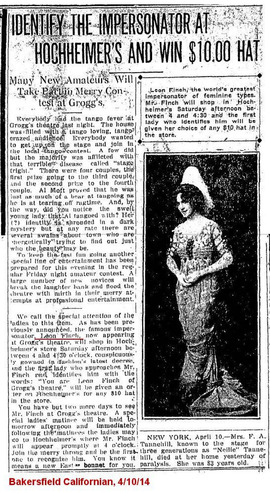 Collection: Newspaper and Periodical Clippings (1900-1949) Institution: JD Doyle Archives Creator: Date: Apr. 10, 1914 Topics: Female impersonators, LGBTQ+ theater, Performance art Subject: Al Mott, Grogg's, Hochheimer's, Leon Finch Description: A short article from the April 10, 1914 issue of the "Bakersfield Californian." The text states that Leon Finch, "the world's greatest impersonator of feminine types," will be at the store Hochheim... -
