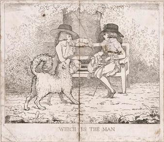 Collection: Art Works Institution: Yale University Libraries Creator: Date: May 30, 1786 Topics: Clothing, Crossdressing, Etching, Pets Description: Two smartly dressed youths facing each other sit on a bench under a tree. A small poodle sits by the one on the right, who has a more delicate appearance and resembles a face seen before in caricat...