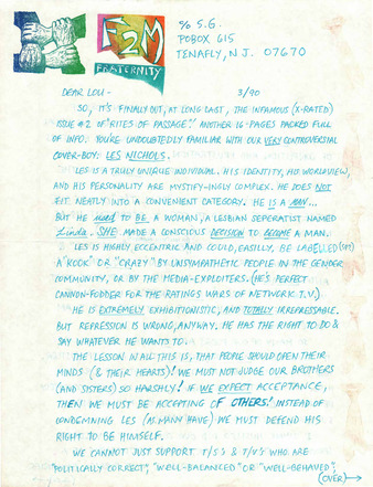 Correspondence from Lou Sullivan to Lin Fraser (October 4, 1989)