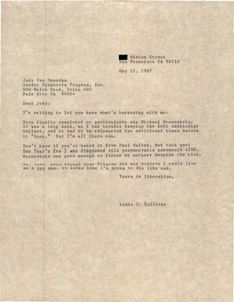 Correspondence from Lou Sullivan to Judy Van Maasdam (May 21, 1987)