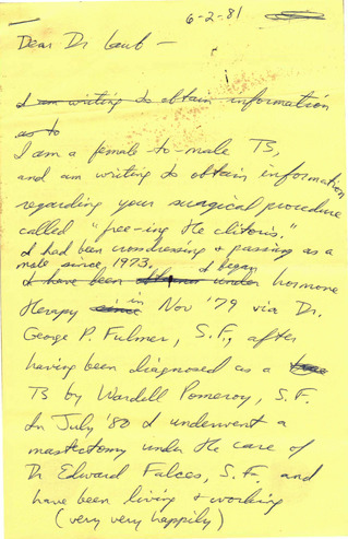 Collection: Lou Sullivan Collection Institution: GLBT Historical Society Creator: Tornabene, Angelo Date: Oct. 3, 1980 Topics: FtMs, Gender realignment surgery, LGBTI community, Phalloplasty, Transitioning (Gender), Transsexual people Subject: Mario Martino, The Labyrinth Foundation Counseling/Gender Service, Inc. -