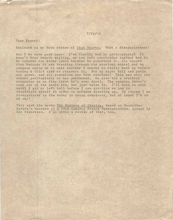 Collection: Lou Sullivan Collection Institution: GLBT Historical Society Creator: Sullivan, Lou Date: Nov. 6, 1980 Topics: Counseling, FtMs, Gay men, Gender dysphoria, Gender realignment surgery, Hormone therapy, Mastectomy, Phalloplasty, Sexuality, Transsexual people Subject: Nicholas Ghosh, Rupert Raj -