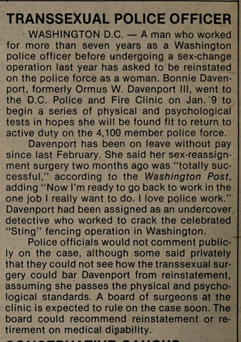 Collection: Newspaper and Periodical Clippings (1950-2000) Institution: Northeastern University Archives and Special Collections Creator: Date: Jan. 27, 1979 Topics: Gender affirming surgery, MtFs, Police, Post-operative, Transsexual people Subject: Bonnie Davenport, Gay Community News Description: An article on a trans woman who seeks to return to the position she had pre-transition as a police officer in Washington DC. Originally published on page 2 of volume 6, number 26 of Gay Community N...