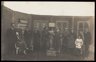 Collection: James Gardiner 20th Century Drag Postcards Institution: Wellcome Library Creator: Date: Jan. 1, 1918 Topics: Female impersonators, Prisoners of war, World War, 1914-1918 Description: French civil prisoners of war at Senne camp, performing 'Les maris de Léontine' written in 1900 by Alfred Capus, a typical salon piece (or 'drawing room comedy') of the type popular in this period -