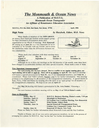 Collection: Monmouth & Ocean News Institution: Joseph A. Labadie Collection, University of Michigan Creator: Date: Apr. 1994 Topics: Clothing, Crossdressers, Discrimination, Gatherings, Gender role, Partners of transgender people, Psychotherapy, Sexual harassment, Support groups, Transsexual people Subject: Roger Peo -