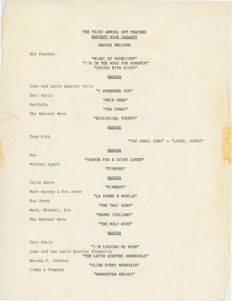 Collection: Marsha P. Johnson & Sylvia Rivera Institution: The Lesbian, Gay, Bisexual & Transgender Community Center Creator: Hot Peaches Date: Unknown Topics: Black transgender people, Drag performers, LGBTQ+ theater, QTPOC, Transfeminine people Subject: Hot Peaches, Marsha P. Johnson Description: Program for the Third Annual Harvest Moon Cabaret, performed by the Hot Peaches and hosted by Marsha P. Johnson.