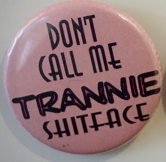 Collection: Button Collection Institution: The ArQuives Creator: MacKay, Xanthra Phillippa, Genderpress, Ross, Mirha-Soleil Date: circa 1990 Topics: Slurs, Transgender people, Transgender publishers, Transsexual people Description: Round button with purple and black text over pink background. The button reads "DON'T CALL ME TRANNY SHITFACE" -