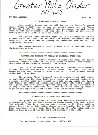 Collection: Cross-Talk: The Gender Community’s News & Information Monthly Institution: Louise Lawrence Transgender Archive Creator: Richards, Kymberleigh Date: Jul. 1992 Topics: Appearance, Beauty standards, Comic strips, Coming out, Cosmetics, Crossdressers, Gender identity, Letters to the editor, LGBTI community, LGBTQ+ partners, Marriage, Support groups, Theatre, Transgender people Subject: International Foundation for Gender Education (IFGE) -