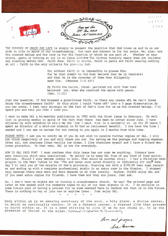 Collection: Grace and Lace Letter Institution: Transgender Archives, University of Victoria Creator: Heller, Lee Frances Date: Jan. 14, 1992 Topics: Christianity, Crossdressers, Crossdressing, Denial, Families, Femininities, Self-acceptance, Spirituality, Support groups, Transgender people Subject: Cross-Talk, Jaye Reverie -