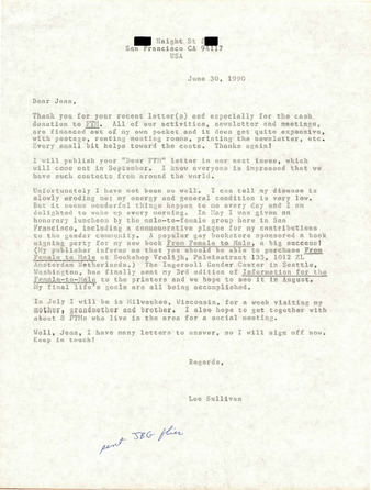 Correspondence from Lou Sullivan to Jean Aarle (June 30, 1990)