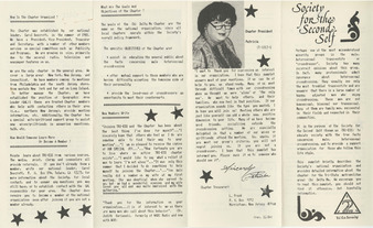 Collection: Informational and Event Brochures Institution: Human Sexuality Collection, Cornell University Creator: Date: 1980? Topics: Crossdressers, Crossdressing, Heterosexuality, Meetings, Support groups Subject: Carol Beecroft, Chi Delta Mu, Femme Mirror, Our Special Joy, Tri-Ess Society for the Second Self Description: Physical item located in Cornell's Mid-Hudson Valley Transgender Association Records, 1970-2014. Collection Number: 7832. -