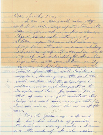 Collection: Advice Columns Institution: Human Sexuality Collection, Cornell University Creator: Date: Unknown Topics: Acceptance, Advice columns, Children, Coming out, Crossdressers, Crossdressing, Education, Families, LGBTQ+ parents, Support groups Subject: Ann Landers, Tri Sigma Description: Physical item located in Cornell's Mid-Hudson Valley Transgender Association Records, 1970-2014. Collection Number: 7832. -